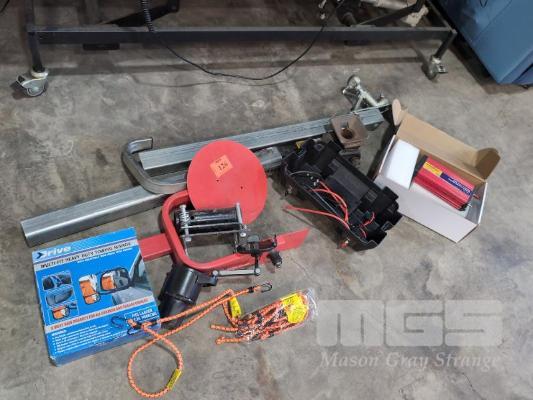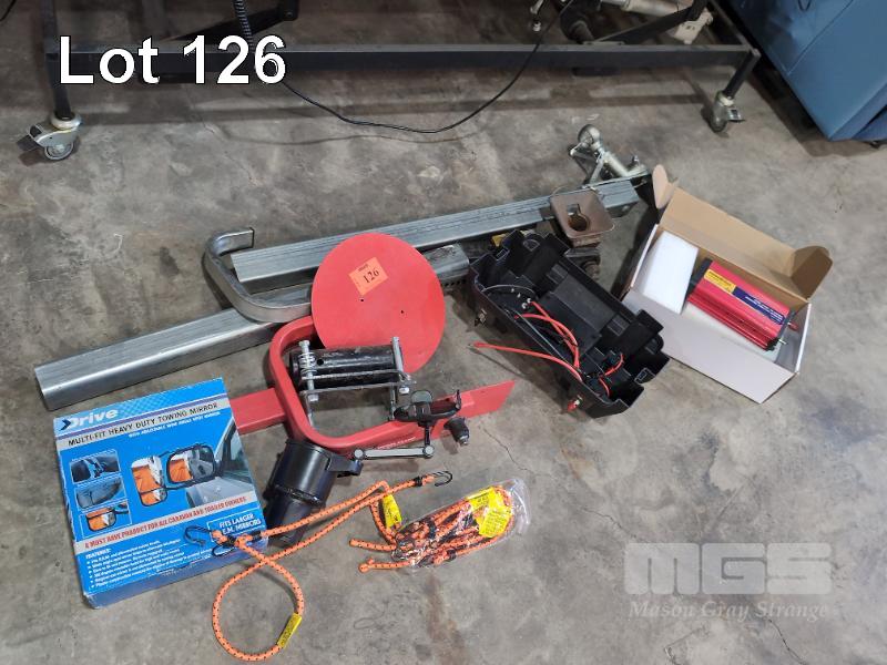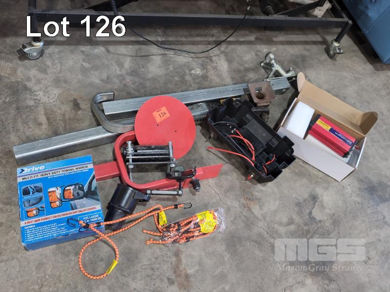 ASSORTED AUTOMOTIVE ITEMS. INCLUDES WHEEL CLAMP, TRAILER HITCH ETC