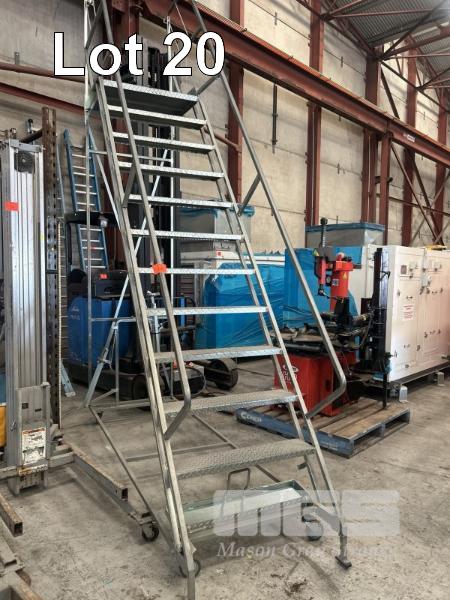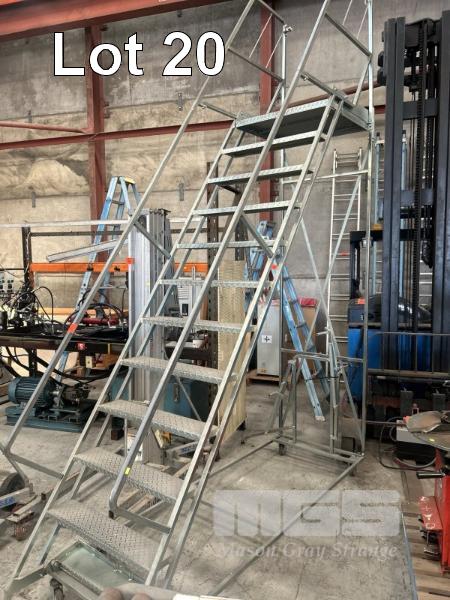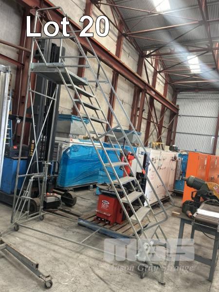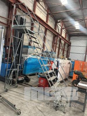 PLATFORM STAIRS, MOBILE, HANDRAILS, GALV STEEL CONSTRUCTION, BOLT TOGETHER, FITTED WITH 2 x HINGED STABILIZERS, 2800mm PLATFORM HEIGHT, 750 x 720mm PLATFORM SIZE, 2600 x 820 x 3850mm (H) OVERALL DIMENSIONS