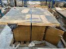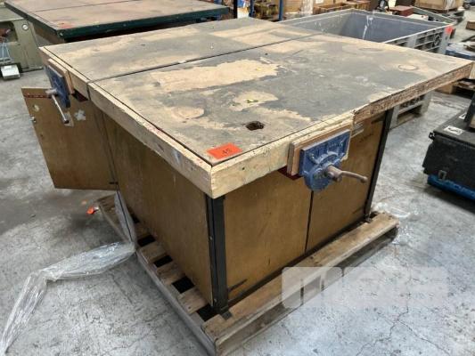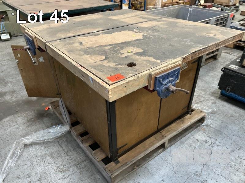 TIMBER WORK BENCH, 1250 x 1400 x 830mm DOUBLE SIDED WITH CUPBOARDS BOTH SIDES & 4 x DAWN WOODWORK VICES