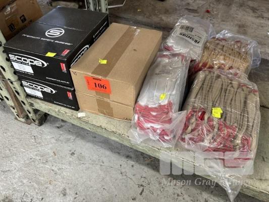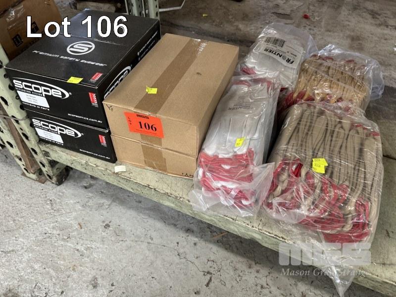 SAFETY GLASSES, SCOPE JET STREAM, CLEAR 2 x BOXES, (10/BOX), 24 x PAIRS GLOVES, FRONTIER SUEDE LEATHER SWAGGY, SIZE: S, 24 x PAIRS GLOVES, PRO GEAR RIGGER MATE, LEATHER SIZE: S & 2 x BOXES GLOVES CLIPS AS NEW