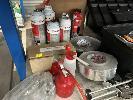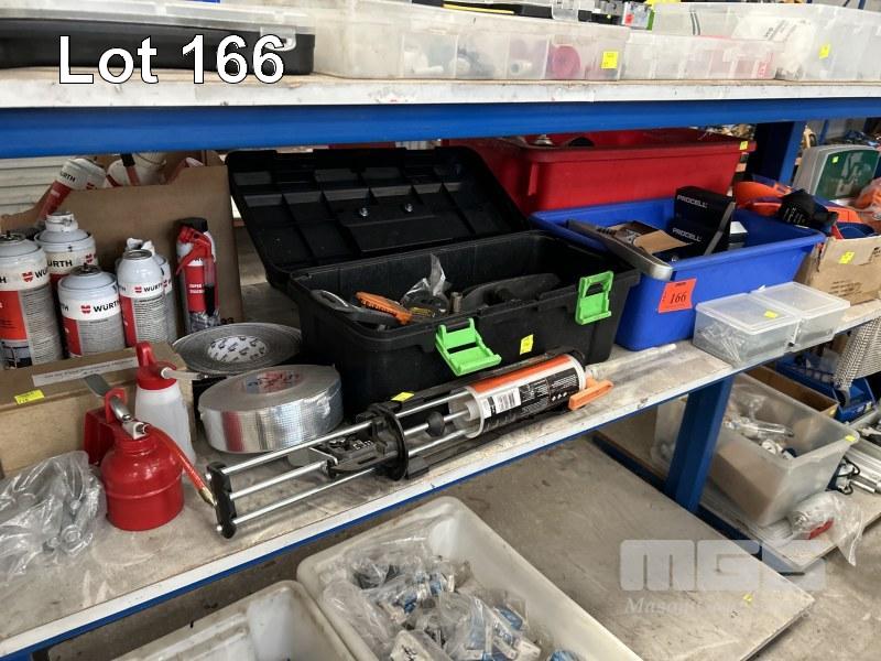 ASSORTED HAND TOOLS, INCLUDING SEALANT GUN, SELF ARREST HARNESS, BATTERIES, TOOL BOXES & SPRAY CANS, 1 x SHELF