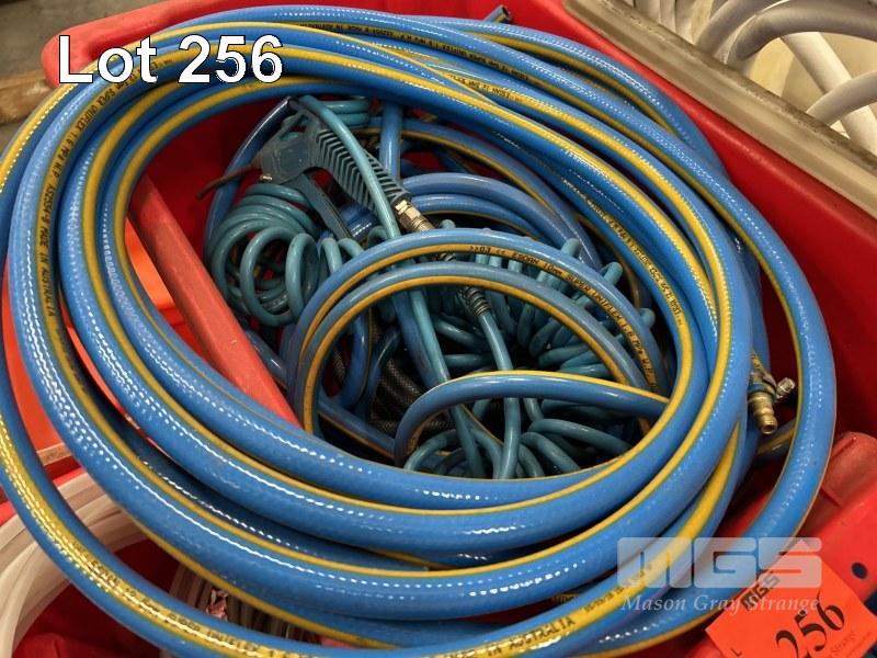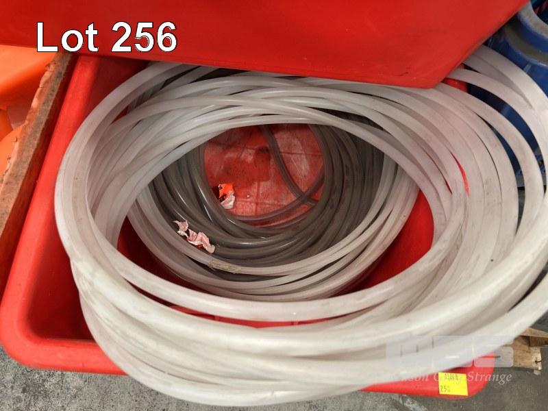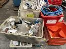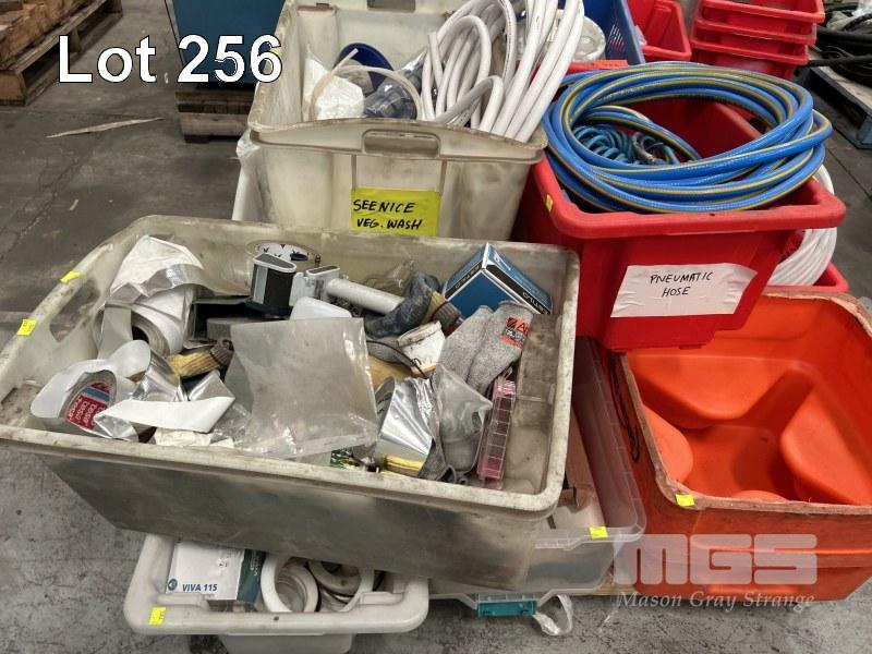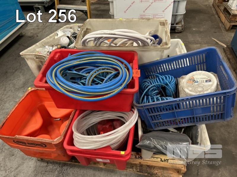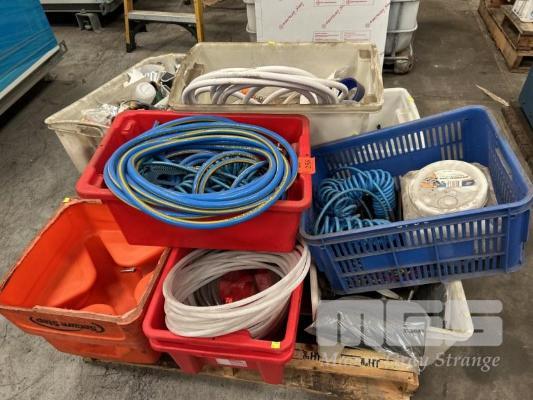 8 x POLY TUBS, RED ASSORTED TYPES WITH CONTENTS INCLUDING AIR HOSE & FITTINGS, TUBES, CHAIN, HOSE CLAMPS, TAPE, ETC, 1 x PALLET