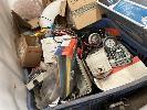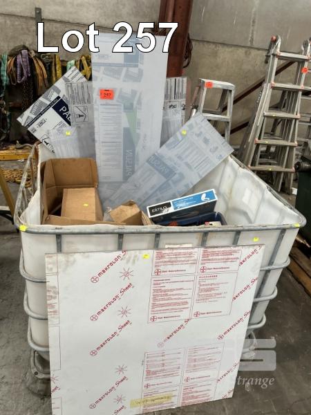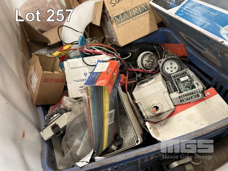 ASSORTED ELECTRICAL PLUGS, GPO'S, POLYCARBONATE SHEETS, LIGHTS, TOILET SEAT, ETC 1 x PLASTIC CRATE