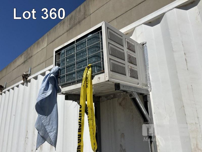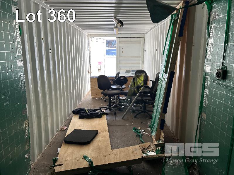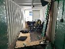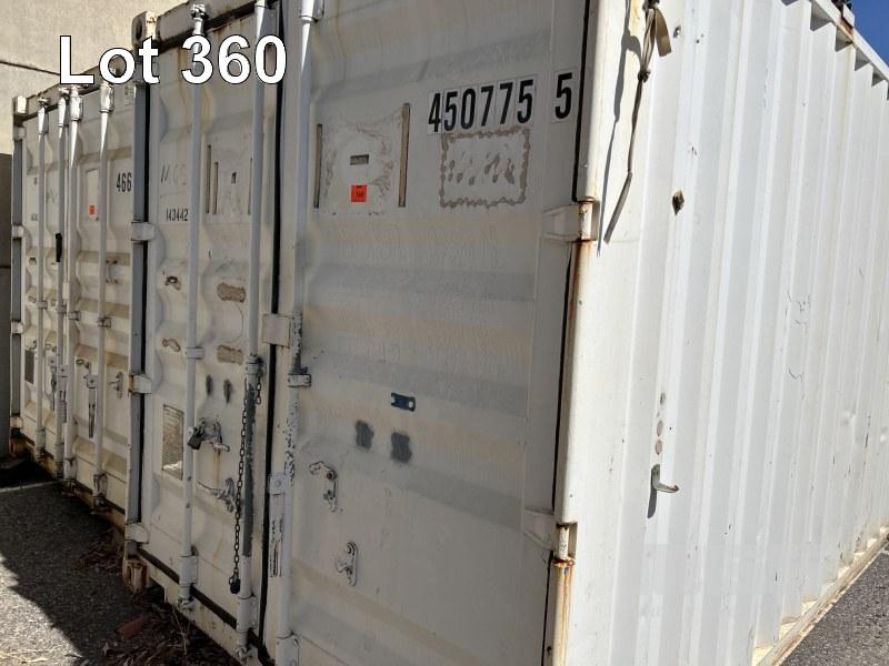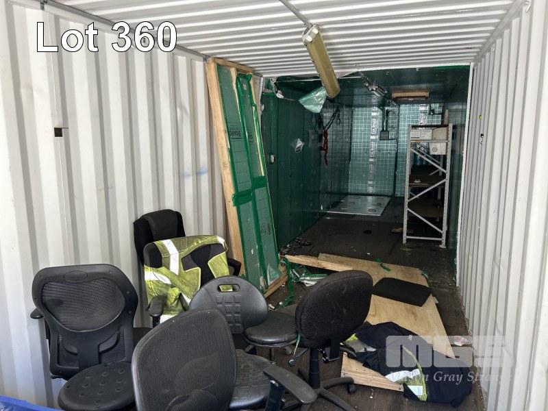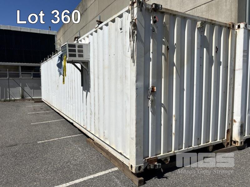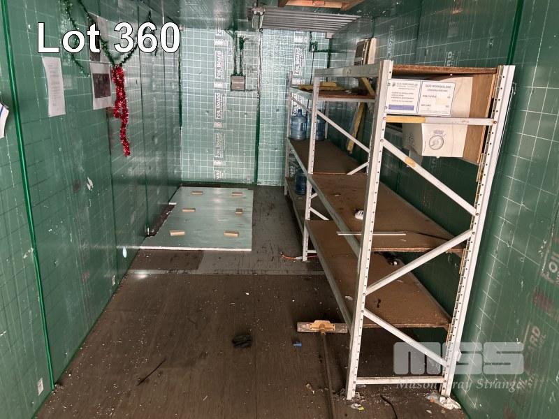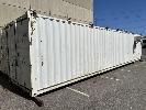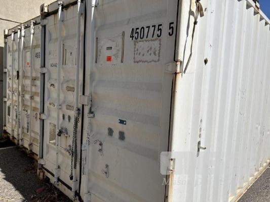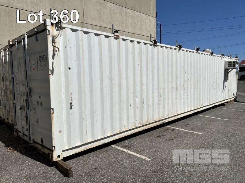 40' SHIPPING CONTAINER, WHITE NO: 4507755 WATER TIGHT FITTED WITH LIGHTING, SHELVING, A/C UNIT THROUGH WALL TYPE MOUNTED ON THE SIDE, ROOF TOP VENT & CONTENTS CHAIRS, ETC TOP MOUNTED FIXTURES TO SUIT DOME