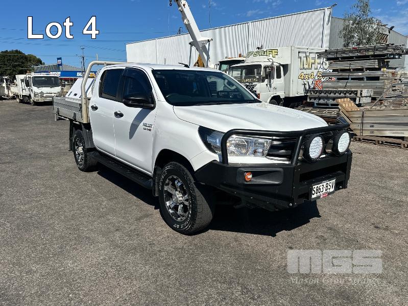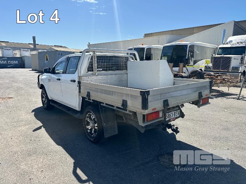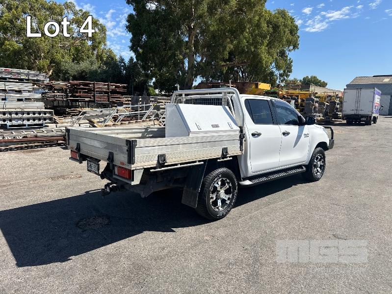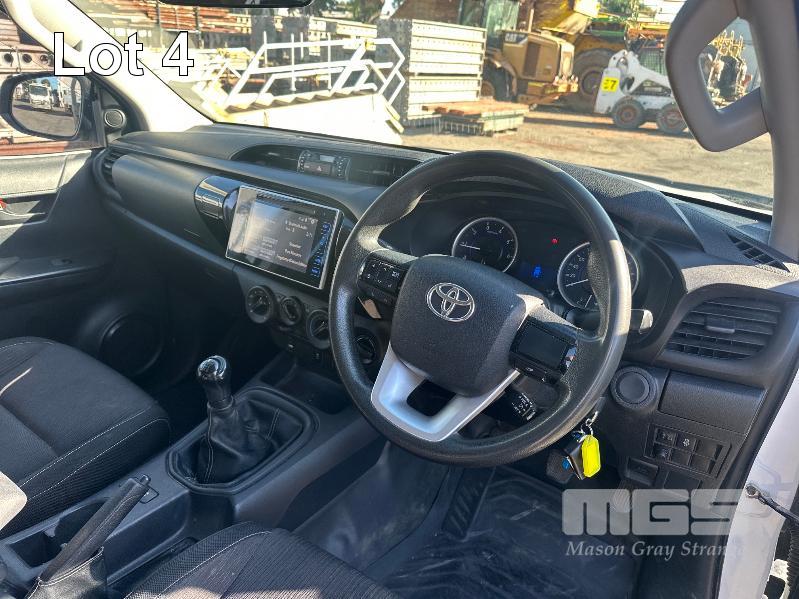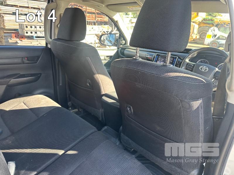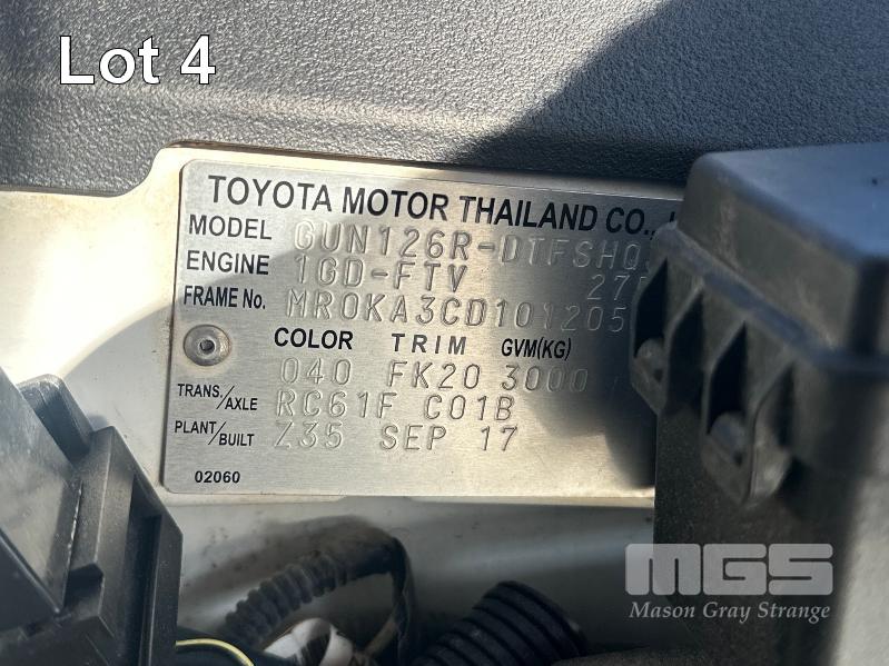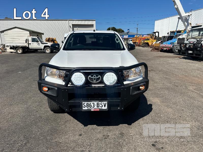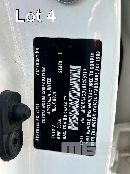 2017 TOYOTA HILUX SR GUN126R DUAL CAB UTE 4X4 REG: S863 BSV (EXPIRED) VIN: MR0KA3CD101205117 ODO: 213,840kms SHOWING 2.8L DTFI DT4, 6 SPEED MANUAL TRANSMISSION, TURBO DIESEL, WHITE DUCO, 4 DOORS, 5 SEAT, 4X4 ABS, AIR BAG, AIR CON, ALLOY TRAY, ALLOY WHEELS, BLUETOOTH, BULL BAR, CD PLAYER, CENTRAL LOCKING, CRUISE CONTROL, FOG LAMPS, IMMOBILISER, POWER WINDOWS, SIDE STEP, SPARE WHEEL, TOOL BOX, TOW BAR, KEY #3 (WITH 2 KEY/S, WITH OWNER'S MANUAL, NO SERVICE BOOKS)