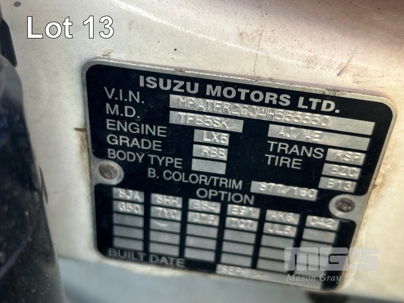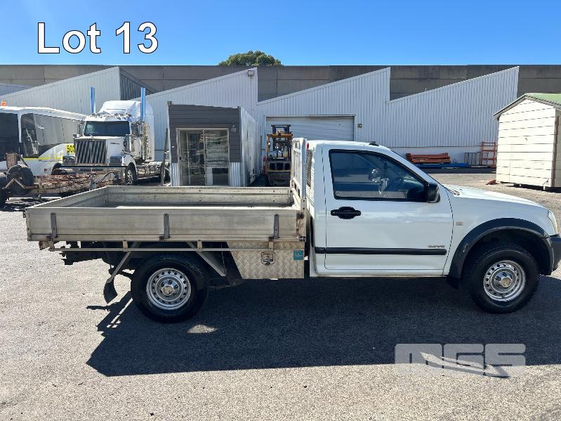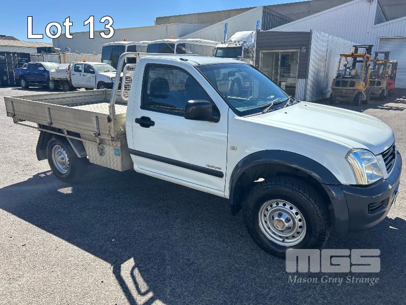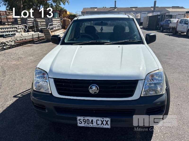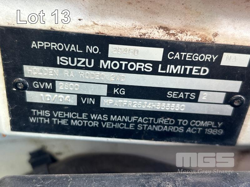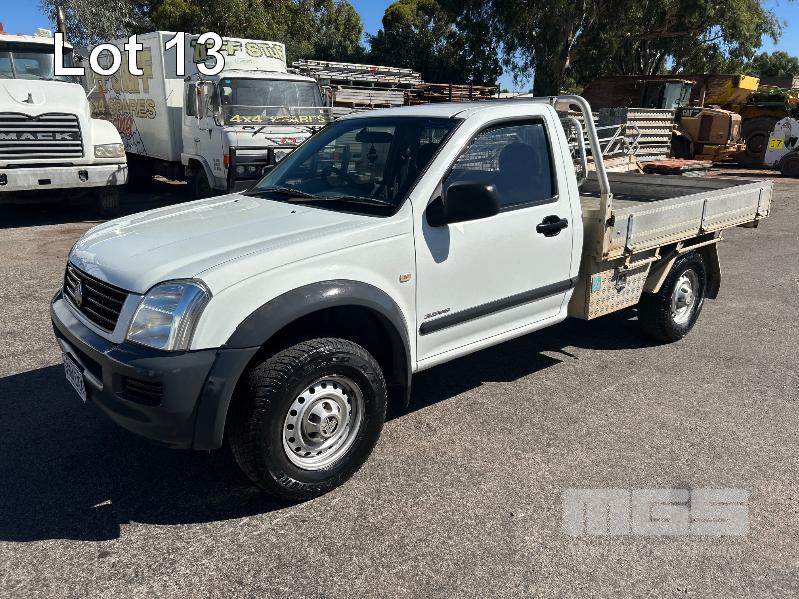 2004 HOLDEN RODEO RA SINGLE CAB TRAY TOP REG: S904 CXX VIN: MPATFR26J4H555550 ENG: 6VE1175317 ODO: 234,028kms SHOWING 3.5 LITRE V6 PETROL, 5 SPEED MANUAL TRANSMISSION, WHITE DUCO, 2 DOORS, 2 SEAT, AIR CON, ALLOY TRAY, CARGO BARRIER, CD PLAYER, POWER STEERING, SPARE WHEEL, TOOL BOX, TOW BAR, KEY #64 (WITH PAPERS, WITH 1 KEY/S, WITH OWNER'S MANUAL, WITH SERVICE BOOKS)