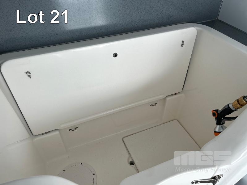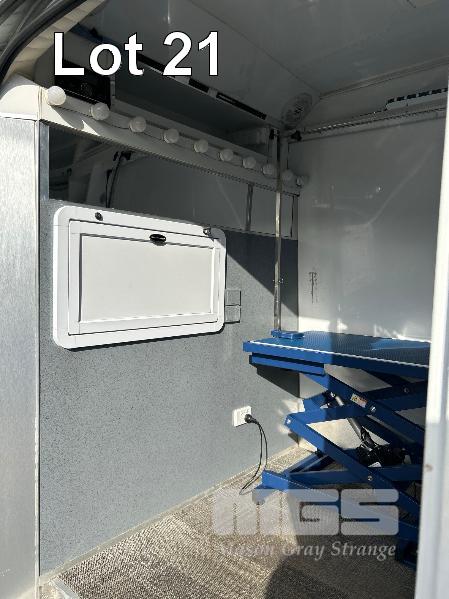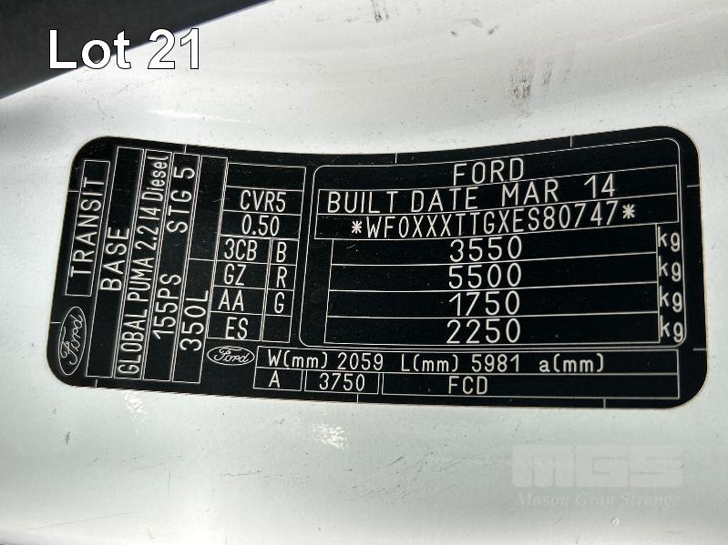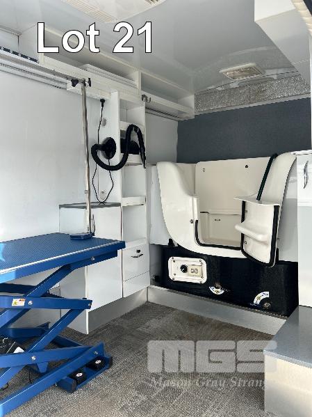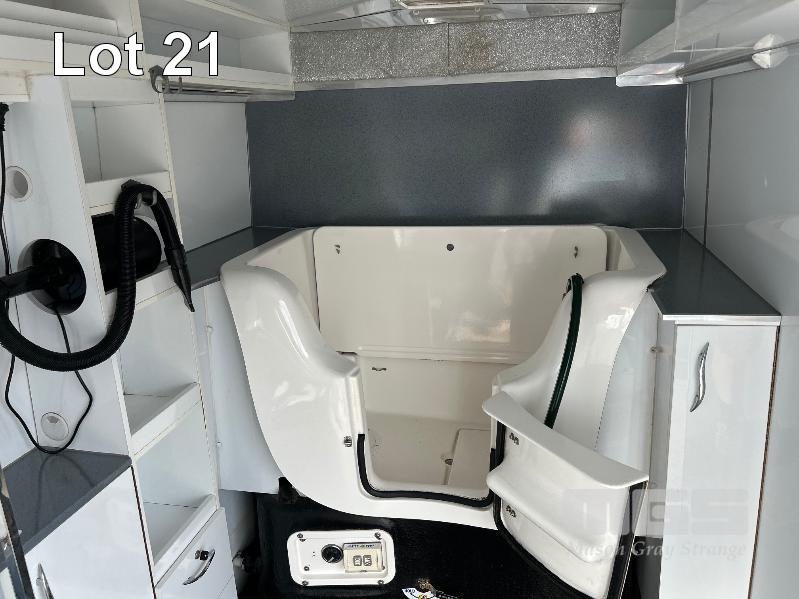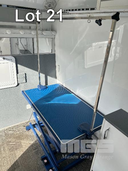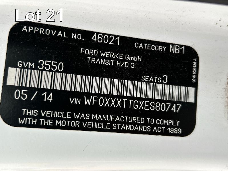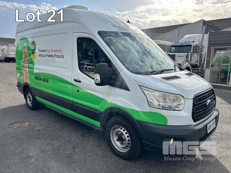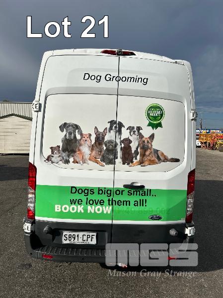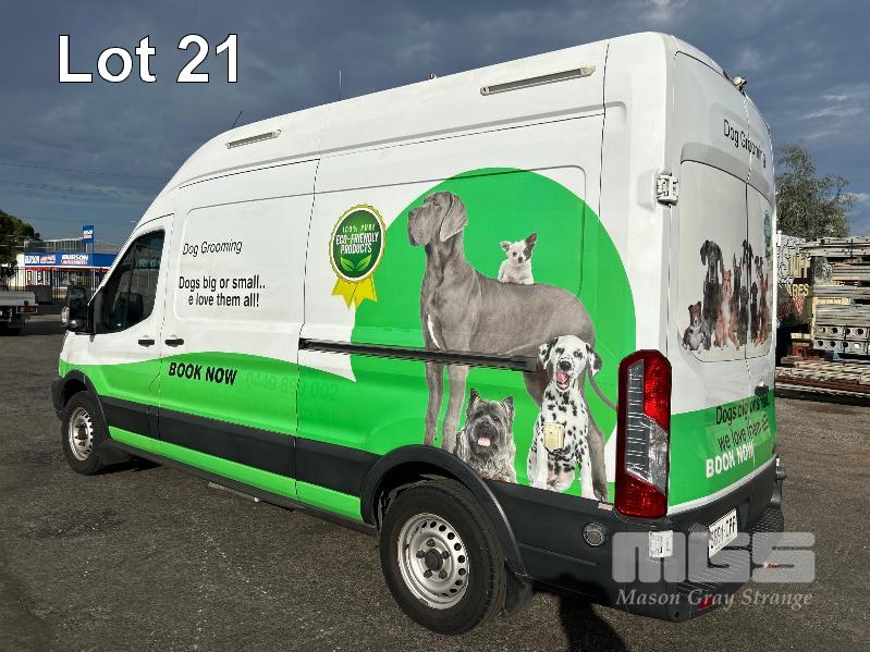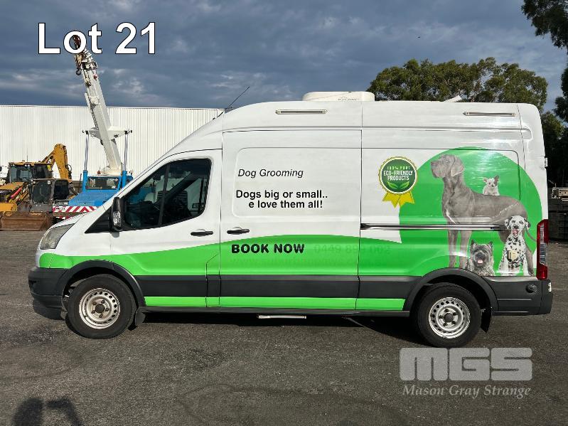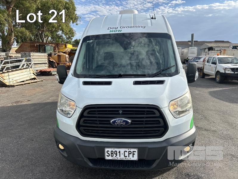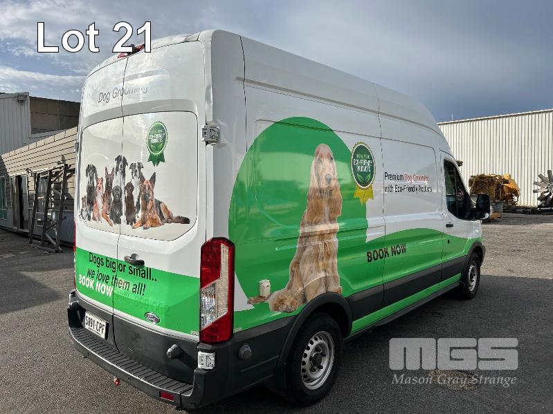 2014 FORD TRANSIT DOG GROOMING VAN, LWB, HIGH ROOF REG: S891 CPF (SA) VIN: WF0XXXTTGXES80747 ENG: ES80747 ODO: 128,354kms SHOWING 2.2 LITRE TURBO DIESEL, 6 SPEED MANUAL TRANSMISSION, WHITE/GREEN DECALS, 4 DOORS, 3 SEAT, AIR BAG, AIR CON, BLUETOOTH, CD PLAYER, CENTRAL LOCKING, CRUISE CONTROL, DECALS, IMMOBILISER, POWER STEERING, POWER WINDOWS, SHELVING, SPARE WHEEL, FITTED WITH SAVEL DOG WASH HYDRO BATH, HEATED WATER SYSTEM WITH SELF CONTAINED PUMP, POWERED GROOMING TABLE THAT CAN BE LOWERED OR HEIGHTENED WITH LEASHING BAR VAN CAN BE PLUGED IN TO 240V MAINS TO POWER THE REAR BUT ALSO HAS SOLAR POWER SYSTEM INC, SOLAR PANEL ON ROOF WITH CHARGER AND BATTERIES AIR COMMAND, SPARROW, ROOF MOUNT AIR CON SYSTEM, 240V CUPBOARDS & SHELF STORAGE, MULTIPLE 240v GPO OUTLETS AIR BLOW DRYER, ROOF TOP VENTILATION, LIGHTING & STEREO, REVERSING CAMERA & LCD SCREEN GVM: 3,550 kg KEY #55 (WITH PAPERS, WITH 2 KEY/S) CONDITION: BODY - MINOR SCRTACHES AND DENTS