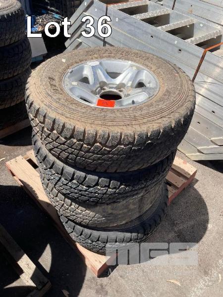 4 x TOYOTA 79 SERIES LANDCRUISER ALLOY RIMS, 5 STUD & TYRES, DUNLOP GRAND TREK ATI