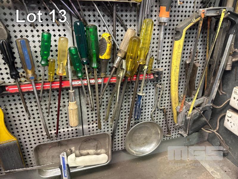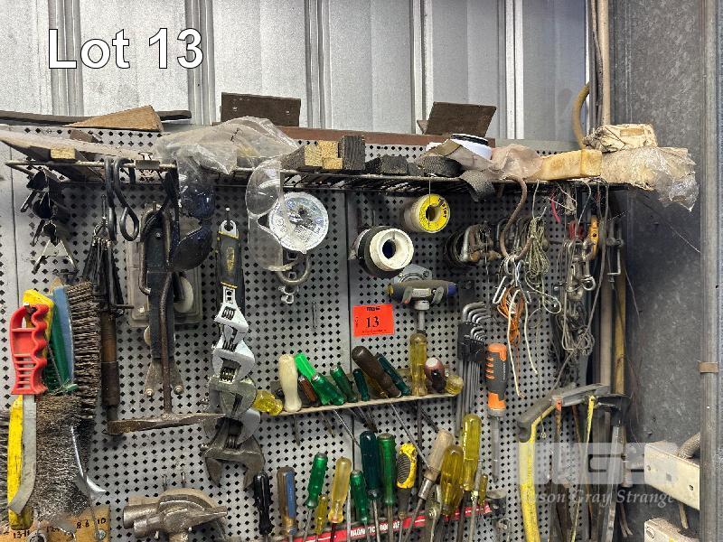 CONTINGENCY OF TOOLS ON SHADOW BOARD, SCREWDRIVERS, HACKSAWS, SHIFTER SET, 7 PIECE MAG TOOL HOLDERS & TURNBUCKLES