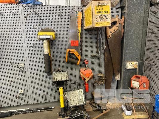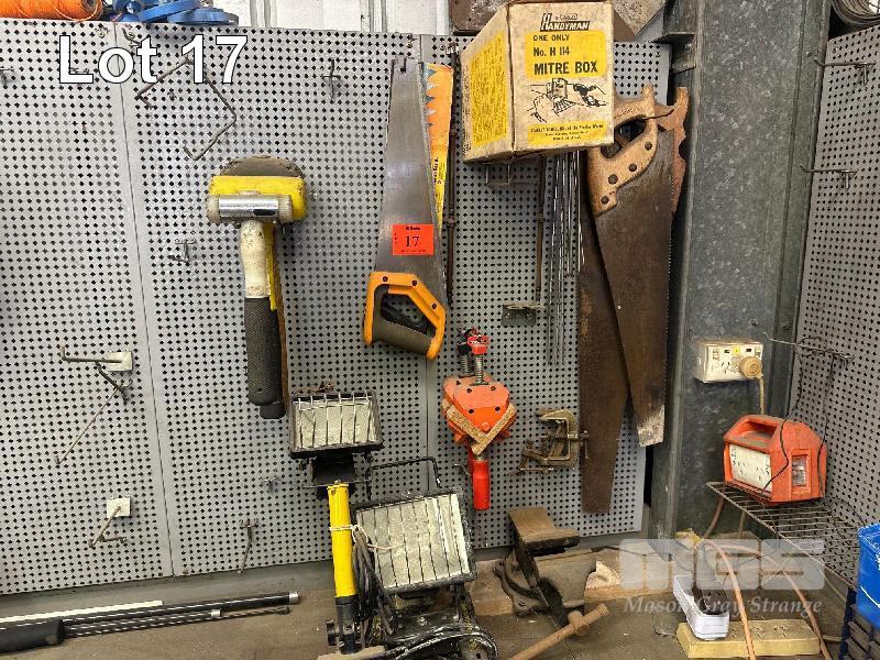 ASSORTED PANEL & BACKSAWS, MITRE BOX, MITRE VICES, BENCH VICE, 100mm, 2 x SPOTLIGHTS & RUBBER & NYLON MALLETS