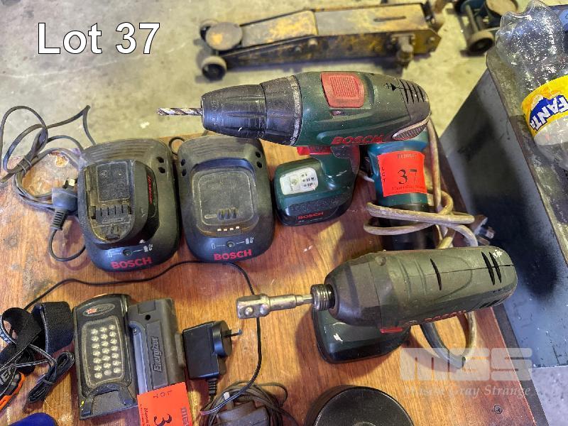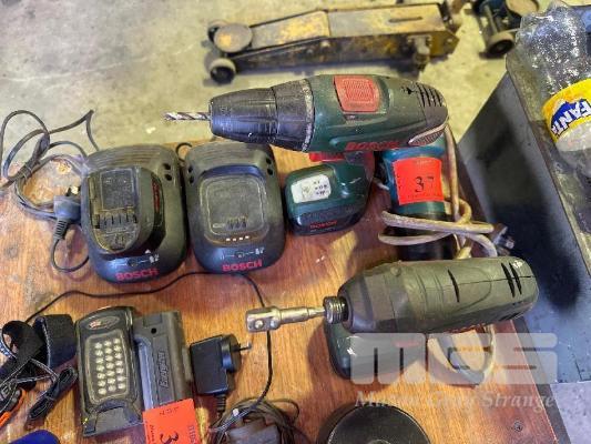 MAKITA GRINDER, 4", BOSCH CORDLESS DRILL & TEK GUN & CHARGERS
