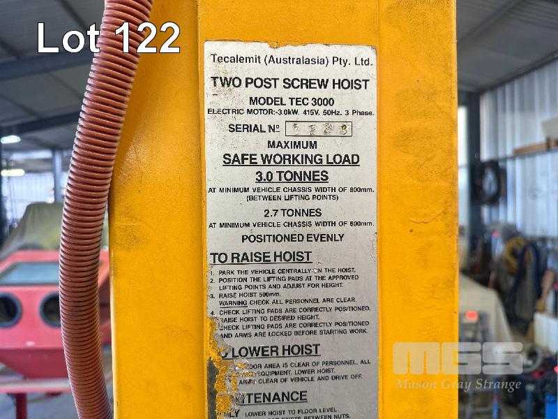 2 POST VEHICLE HOIST, TECALEMIT MOD: TEC3000 S/NO: 7228 3,000kg CAPACITY 415V