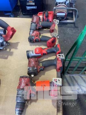 2 x MILWAUKEE 18V DRILLS, TEK GUN, IMPACT GUN 1/2", TORCH & CHARGER, NO BATTERIES