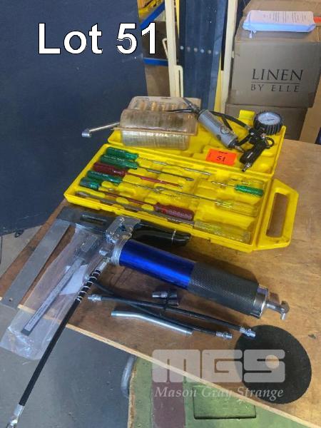 DRIVER SET, AIR FITTINGS, GREASE GUN, DIGITAL VERNIER & SET SQUARE