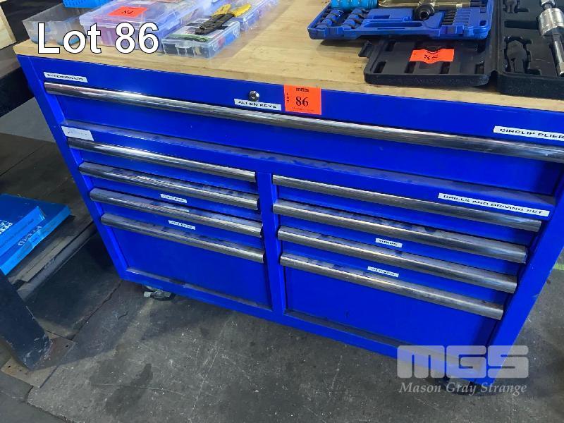 MOBILE ROLL CAB BASE, 1200 x 500mm, 9 DRAWER & ASSORTED TOOLS