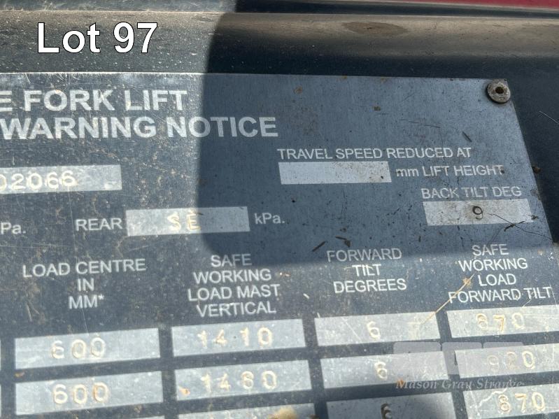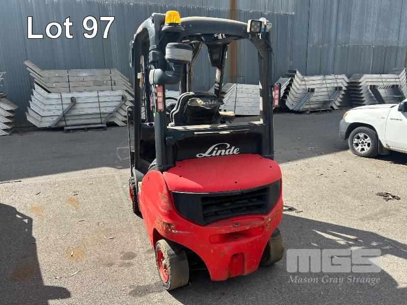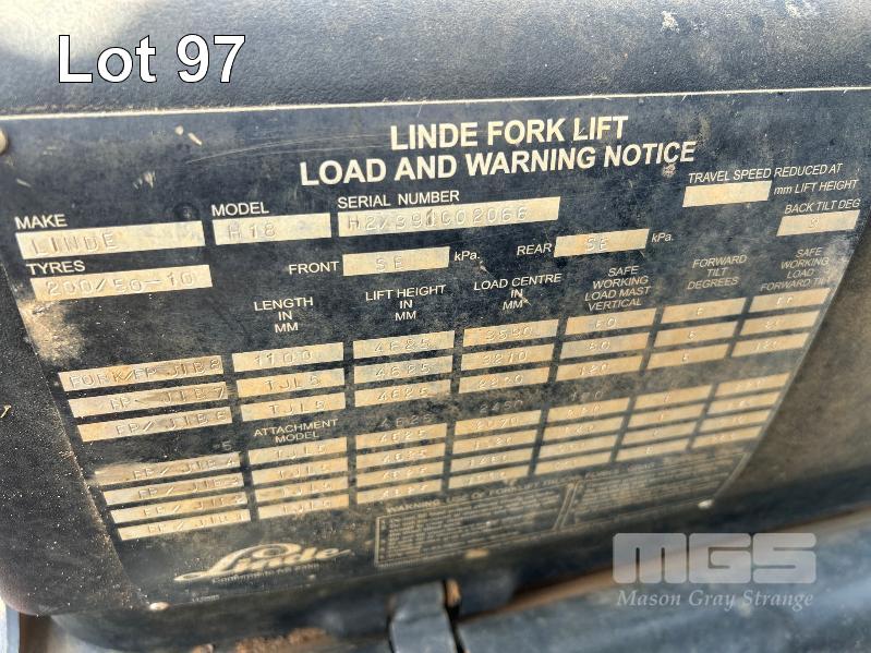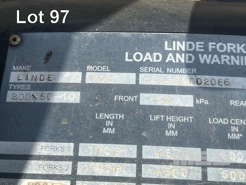 2012 FORKLIFT, LINDE MOD: H18D-01 S/NO: H2X391C02066 1.8T POWERED BY 26kw DIESEL ENGINE 2 STAGE CONTAINER MAST WITH TYNE POSITIONING & SIDE SHIFT SOLID TYRES MAX LIFT CAP RATED: 1400kg @600mm LOAD CENTRE MAX LIFT HEIGHT: 4625mm NOTE: ALL FAULTS NOT WORKING, POSSIBLE ENGINE/TRANSMISSION FAULT