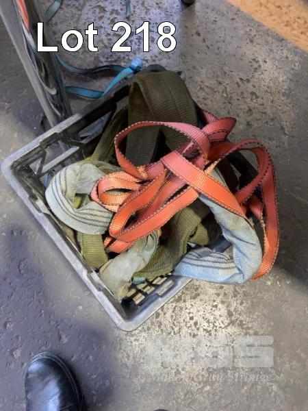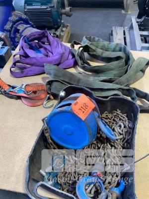 CHAIN BLOCK, 1 TON SOFT LIFTING SLINGS & CRATE OF TIE DOWNS & SLINGS