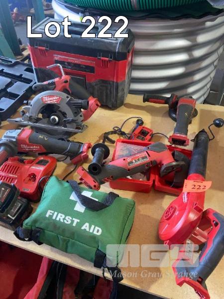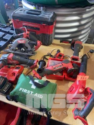 MILWAUKEE CORDLESS POWER TOOLS, INCL CIRCULAR SAW, 7" 2 x ANGLE GRINDERS, 115mm SANDER, F18FMT BLOWER , VACUMM 2 x BATTERIES 1 x CHARGER 2 x CARRY BAGS