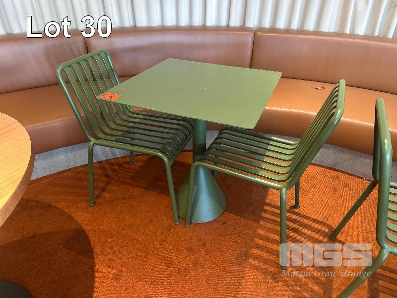 HAY CAFE TABLE, 650 x 650 x 740mm (H), STEEL FRAME & TOP, OLIVE GREEN, CONCRETE PEDESTAL BASE & 2 x HAY CHAIRS