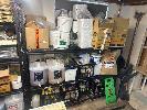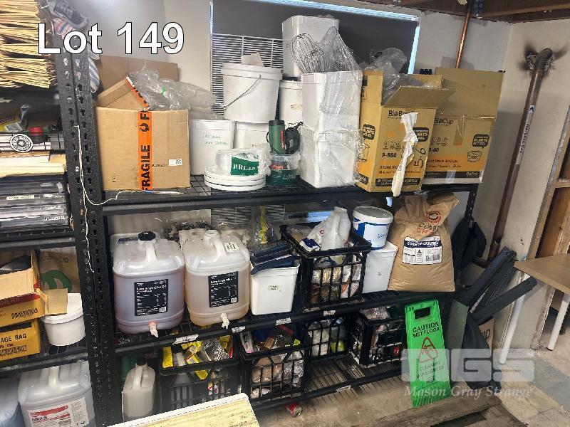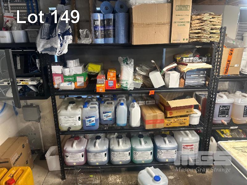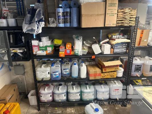 STORAGE RACKS, 1800 x 550 x 1800mm, 3 & 4 TIER WITH CONTENTS LARGE QUANTITY CLEANING PRODUCTS, COOKING OILS, TAKEAWAY CONTAINERS, ETC