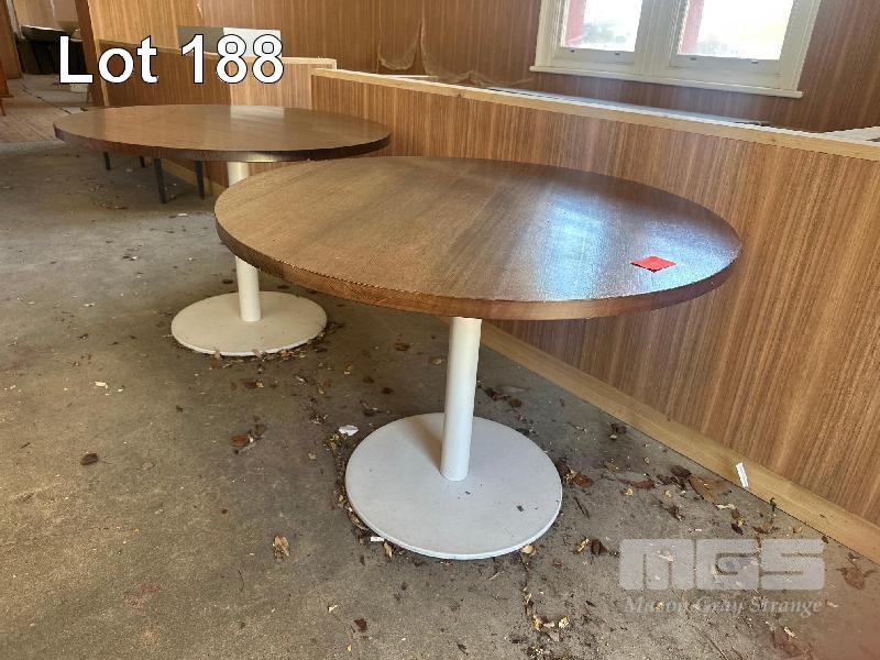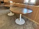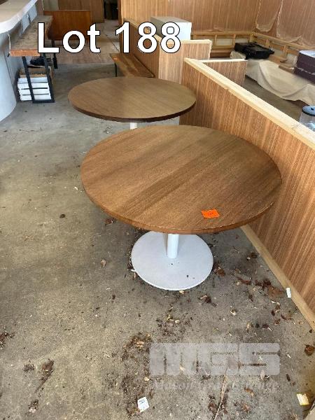 2 x CAFE TABLES, 1100mm (D) TIMBER TOP, WHITE STEEL BASE,