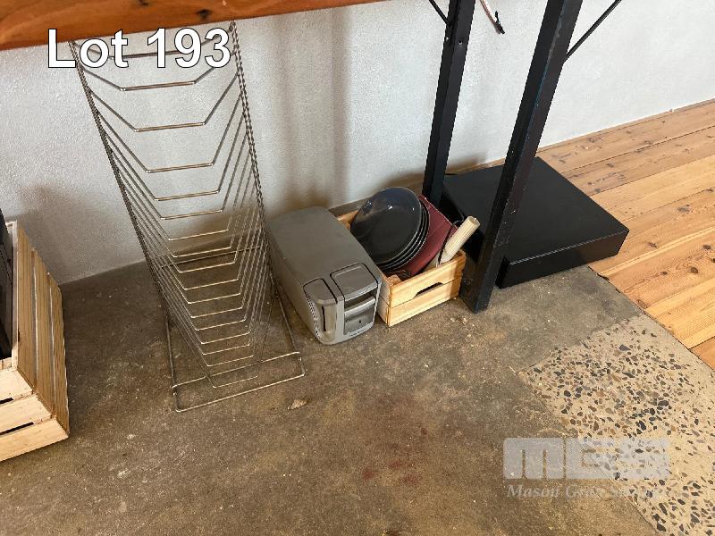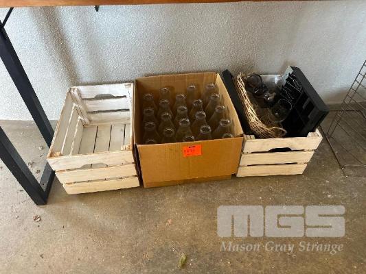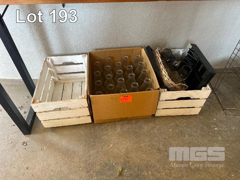 21 x GLASS MILK JUGS, 2 x DECORATIVE TIMBER CRATES, STAINLESS STEEL TRAY HOLDER & CASH DRAWER