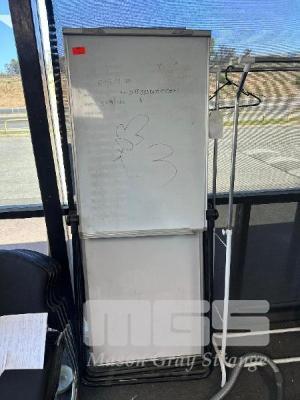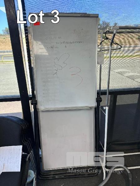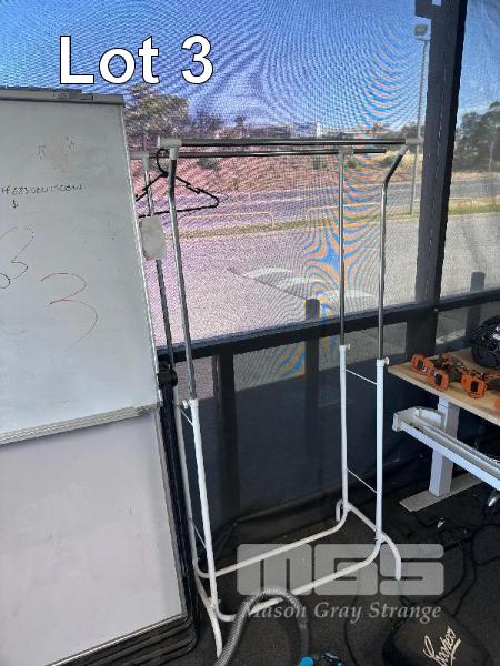 4 x STACKABLE VISITORS CHAIRS, 2 x FREESTANDING WHITEBOARDS & CLOTHES RACK