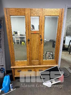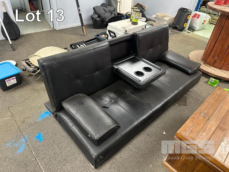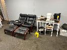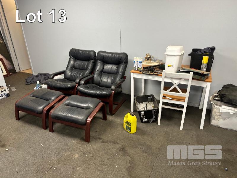 ALL THE FURNITURE!, 2 x BLACK LEATHER SEATS WITH FOOT RESTS, 2 x 3 SEATER BLACK LEATHER LOUNGES, 1 x TIMBER SIDE TABLE, 1 x TIMBER COFFEE TABLE/CHEST, 1 x WARDROBE, 1 x STEEL FILING CABINET, SQUARE TABLE & CHAIRS, 1 x MOBILE DRY BAR (CABLE REEL)