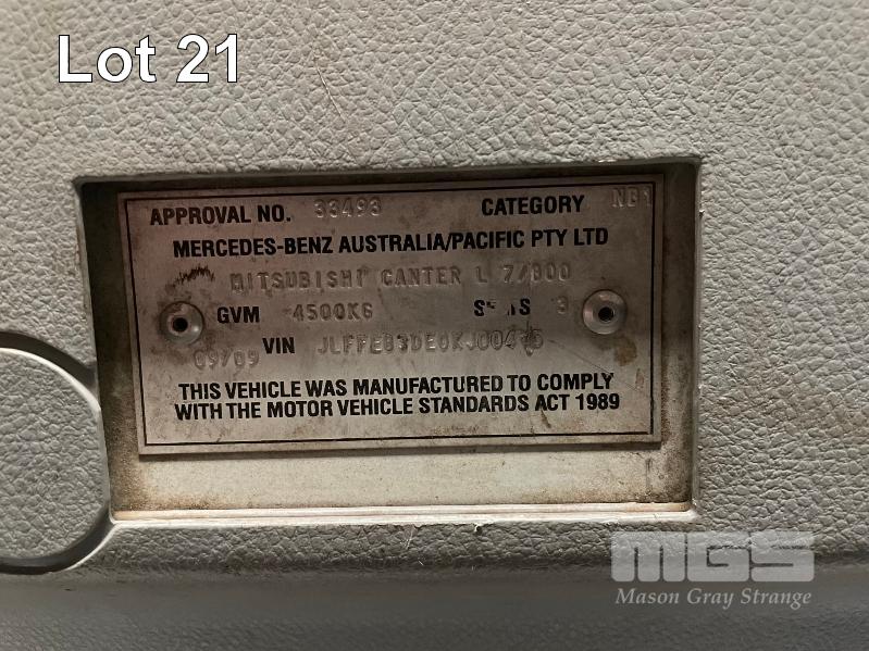 2009 MITSUBISHI CANTER L 7/800 4X2 TRAY TOP TRUCK REG: S894AES (SA) VIN: JLFFE83DE0KJ004?5 ODO: 277,494 GVM: 4500 MANUAL, 3 DOORS, 3 SEAT, AIR CON, STEEL DROP SIDE TRAY, MOUNTED TOOL BOX, NOTE: NOT RUNNING, NO BATTERIES, ALL FAULTS, FRONT END DAMAGE (NO PAPERS, WITH 1 KEY/S, NO OWNER'S MANUAL, NO SERVICE BOOKS)