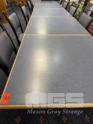 5 x DINING TABLES, 80 x 80cm, BLUE LAMINATE WITH TIMBER EDGE, BLACK SINGLE PEDESTAL BASE