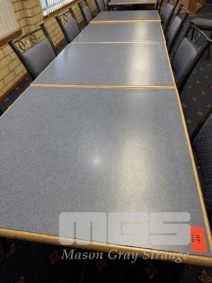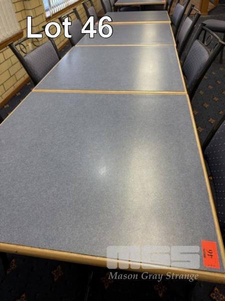 4 x DINING TABLES, 80 x 80cm, BLUE LAMINATE WITH TIMBER EDGE, BLACK SINGLE PEDESTAL BASE
