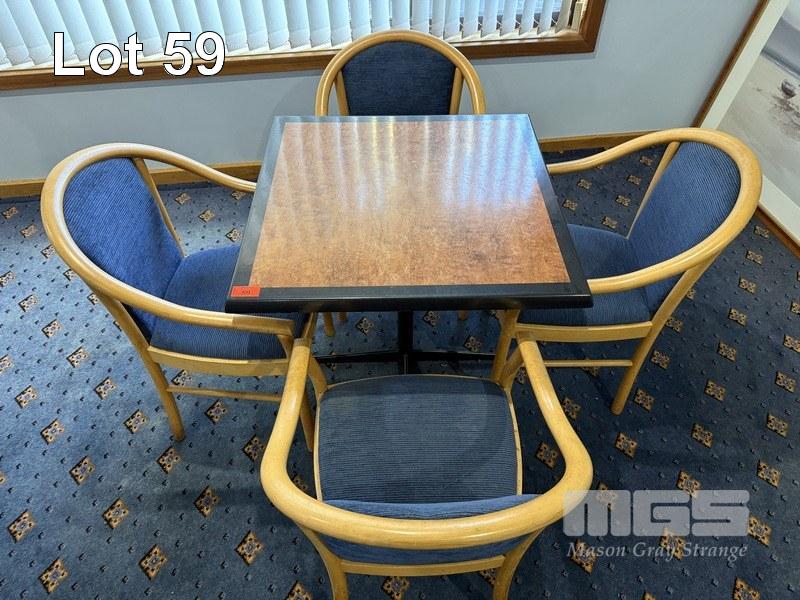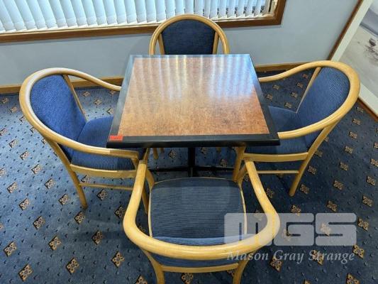 2 x DINING TABLES, 80 x 80cm & 8 x TIMBER FRAMED ARMCHAIRS, BLUE FABRIC UPHOLSTERED