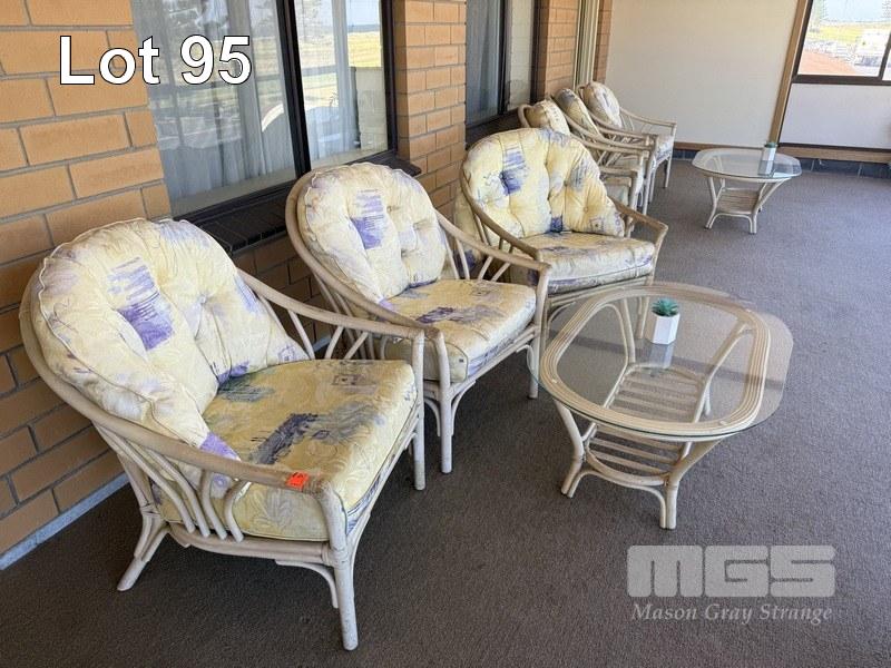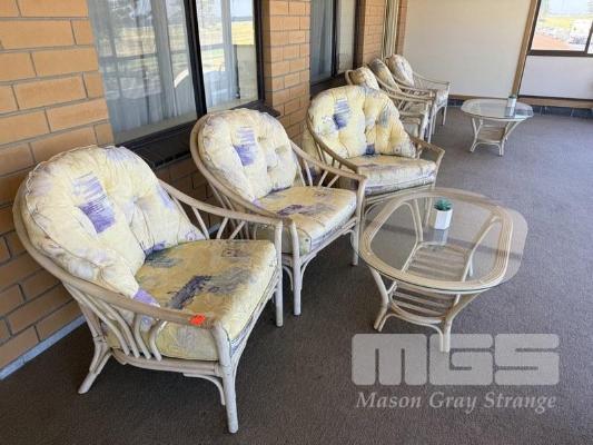 2 x 4 PIECE CANE SUNROOM SETTINGS, 3 x ARM CHAIRS WITH PLUSH CUSHIONS & OVAL COFFEE TABLE
