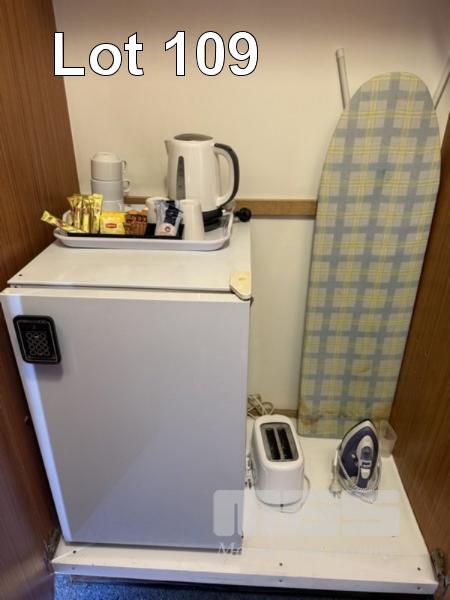 ROOM 216 QUEEN SIZE ENSEMBLE, CIRCULAR TABLE, 60cm, BLUE LAMINATE, 2 x ARM CHAIRS, FABRIC SEAT & BACK, TUBULAR STEEL FRAME, KOGAN TV, 32" (2024) MOD: KALED3229410A LEMAIR BAR FRIDGE, 130 LITRE, CORDLESS KETTLE, TOASTER, 2 SLICE, COFFEE CUPS, SAUCER, WASTE PAPER BIN IRON & IRONING BOARD SINGLE BED ENSEMBLE (EXCLUDES LINEN)
