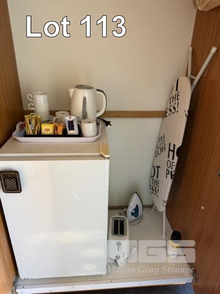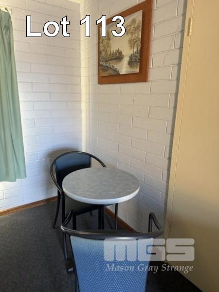 ROOM 118 QUEEN SIZE ENSEMBLE, CIRCULAR TABLE, 60cm, BLUE LAMINATE, 2 x ARM CHAIRS, FABRIC SEAT & BACK, TUBULAR STEEL FRAME, KOGAN TV, 32" (2024) MOD: KALED3229410A LEMAIR BAR FRIDGE, 130 LITRE, CORDLESS KETTLE, TOASTER, 2 SLICE, COFFEE CUPS, SAUCER, WASTE PAPER BIN IRON & IRONING BOARD SINGLE BED ENSEMBLE 7 x WICKER & ALUMINIUM ALFRESCO CHAIRS (EXCLUDES LINEN)