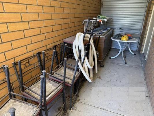 SUNDRY EQUIPMENT INCLUDING GOLDSTEIN BAIN MARIE, (OLD POOR), 14 x OLD CHAIRS & 2 x OLD TABLES