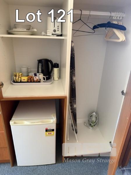 ROOM 125 QUEEN SIZE ENSEMBLE CIRCULAR TABLE, 60cm, BLUE LAMINATE, 2 x ARM CHAIRS, FABRIC SEAT & BACK, TUBULAR STEEL FRAME, AVA TV, 32" SHARP MICROWAVE GVA BAR FRIDGE, 130 LITRE, CORDLESS KETTLE, TOASTER, 2 SLICE, COFFEE CUPS, SAUCER, WASTE PAPER BIN (EXCLUDES LINEN)