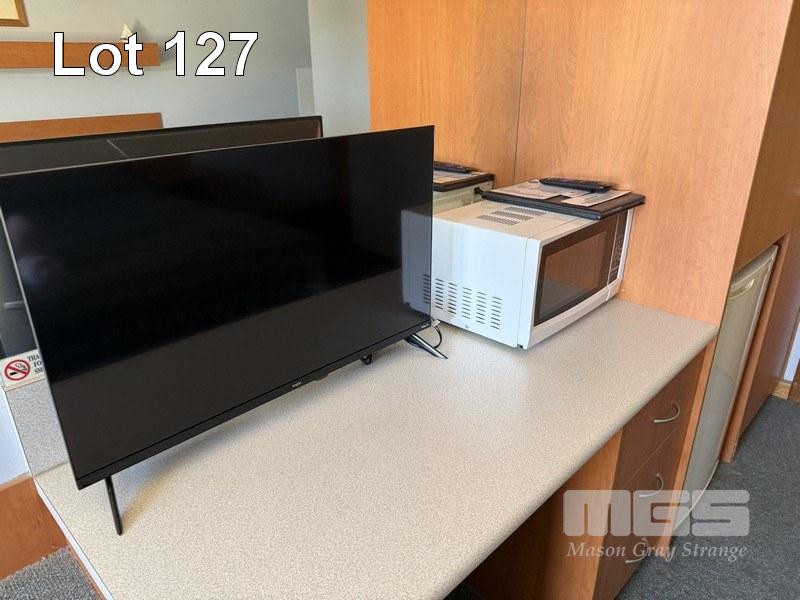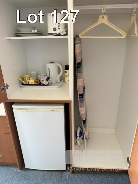 ROOM 130 QUEEN SIZE ENSEMBLE, CIRCULAR TABLE, 60cm, BLUE LAMINATE, 2 x ARM CHAIRS, FABRIC SEAT & BACK, TUBULAR STEEL FRAME, KOGAN TV, 32" (2024) MOD: KALED3229410A SAMSUNG MICROWAVE, 800w, LG BAR FRIDGE, 130 LITRE, CORDLESS KETTLE, TOASTER, 2 SLICE, IRON & IRONING BOARD, COFFEE CUPS, SAUCER, WASTE PAPER BIN (EXCLUDES LINEN)