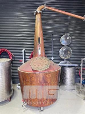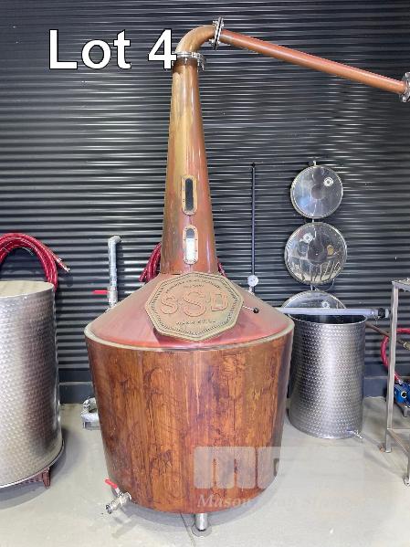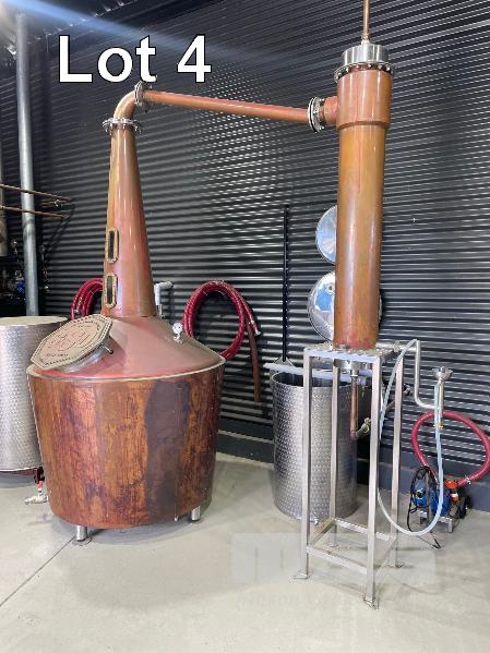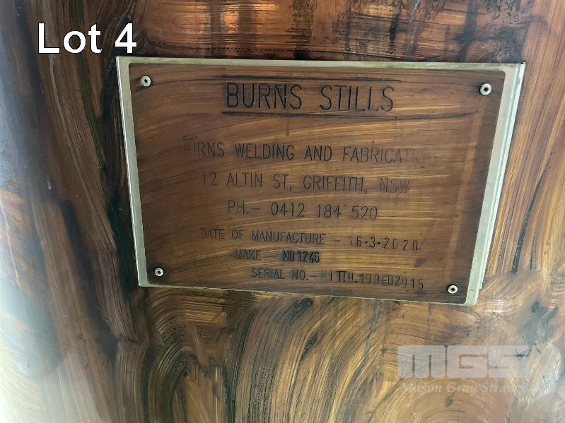 BURNS STILLS COPPER WASH STILL, MAKE: MB1246, DOM: 2020, SERIAL: MITCH.19DEQ2015, 1250L CAP, TUBE CONDENSER, FABRICATED USING 3mm COPPER SHEET, STEAM JACKET & INSULATED BARREL, 3" SUMP & 4" SITE GLASS, 450mm BRASS MANWAY, 32mm PRESSURE VACUUM, 75mm STAINLESS STEEL LEGS, INCLUDES CONDENSER WITH PARROT BEAK TO SUIT MADE IN NSW