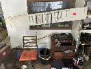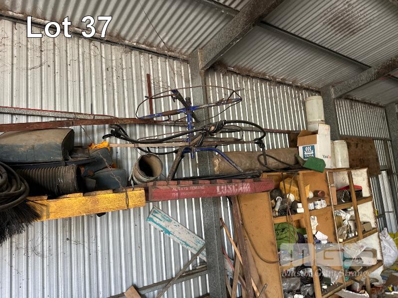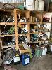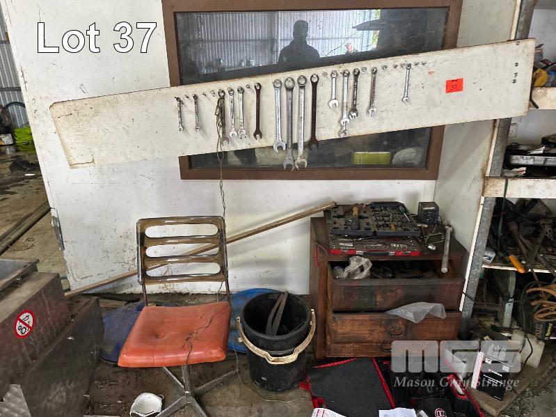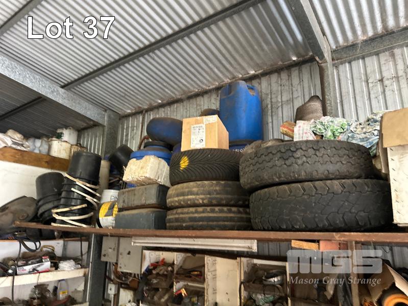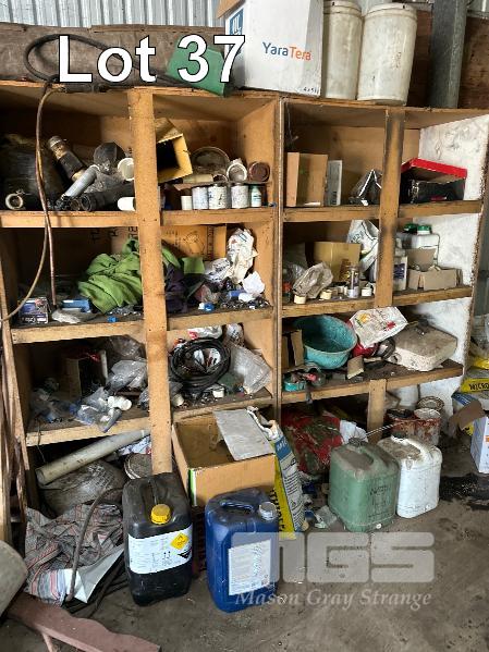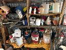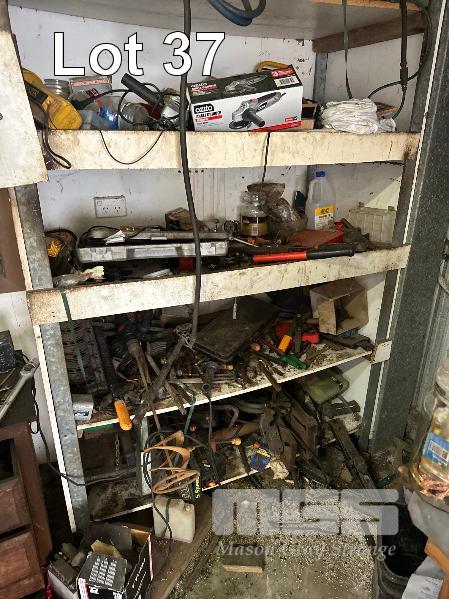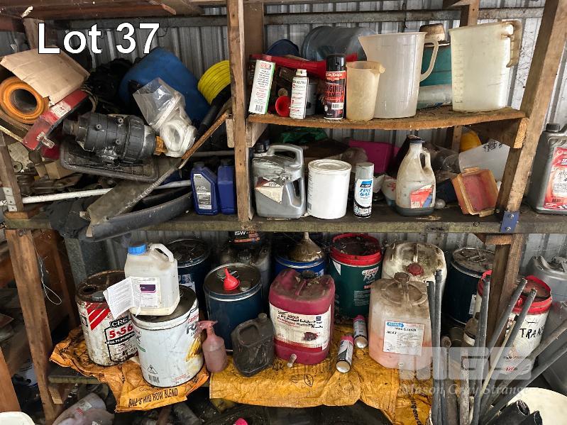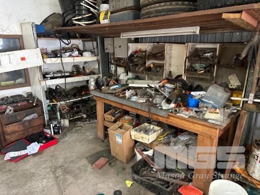 TOOLS, OILS, PARTS, FURNITURE, REMAINING TOOLS IN SHED, GRINDER, SAWS, DRILL PRESS, SPINNER & SHELVING