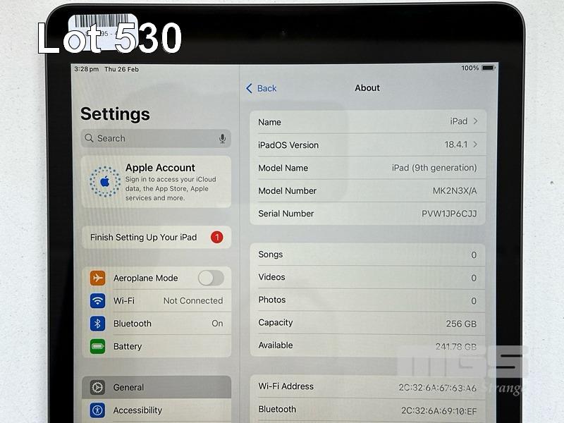 APPLE iPAD 9TH GEN, 256GB, Wi-Fi, SPACE GREY, MODEL MK2N3X/A, A2602 WITH CABLE (NO CHARGER) S/N:PVW1JP6CJJ