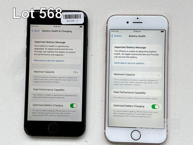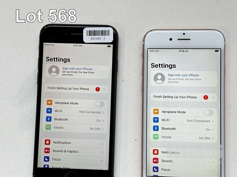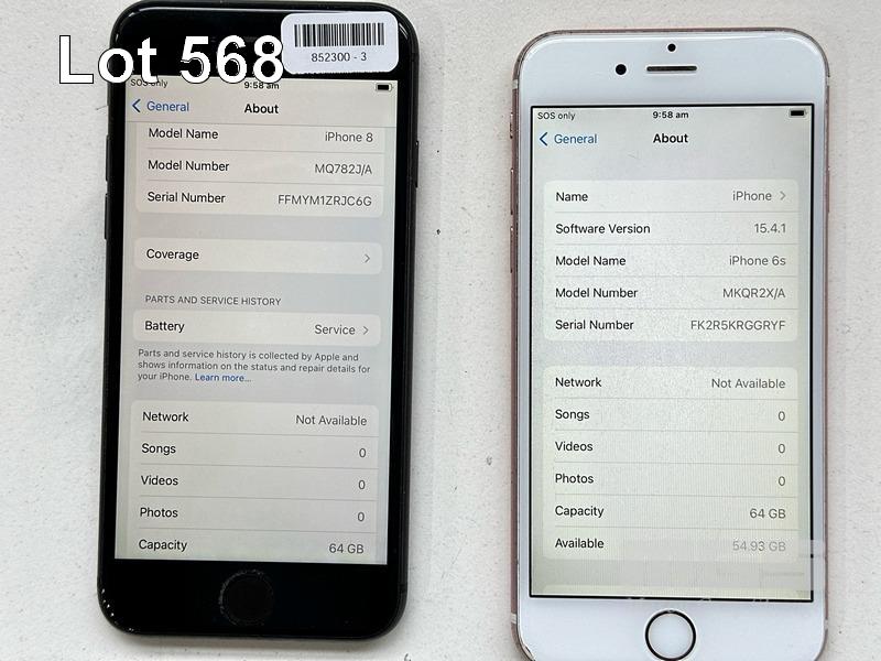 2 x APPLE iPHONES INC. - APPLE iPHONE 8, 64GB, MQ782J/A - APPLE iPHONE 6S, 64GB, MKQR2X/A (NOTE: BATTERY SERVICE MESSAGE, SCRATCHES ON SCREEN) (NO CABLES, NO CHARGERS) S/N:FFMYM1ZRJC6G, FK2R5KRGGRYF