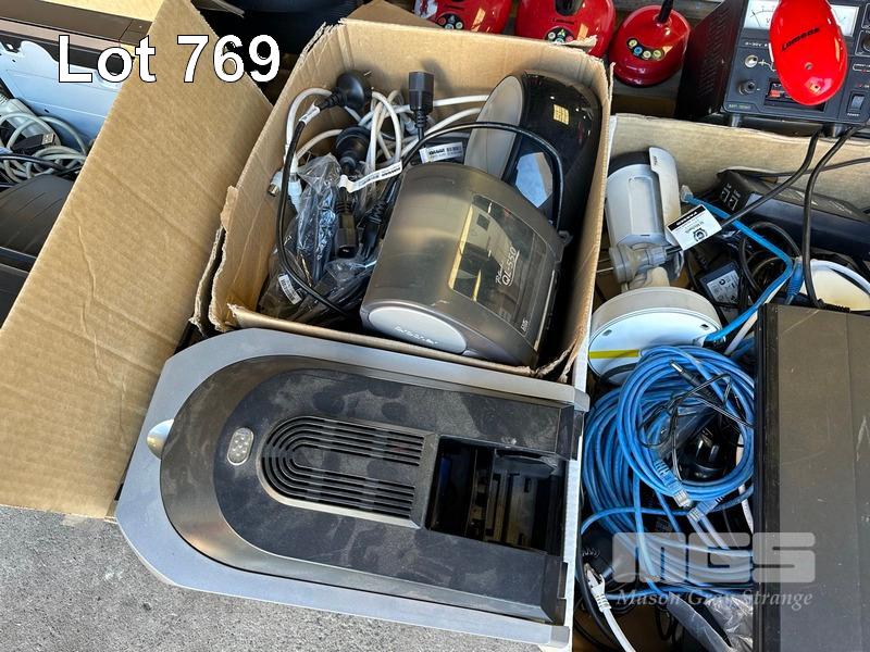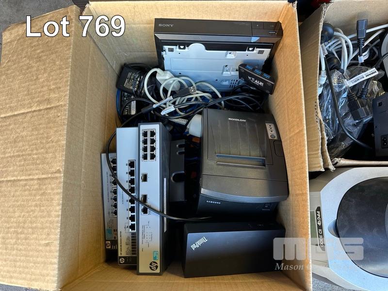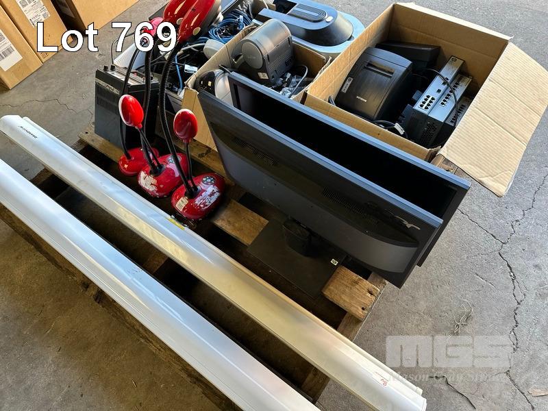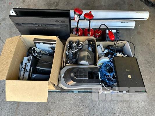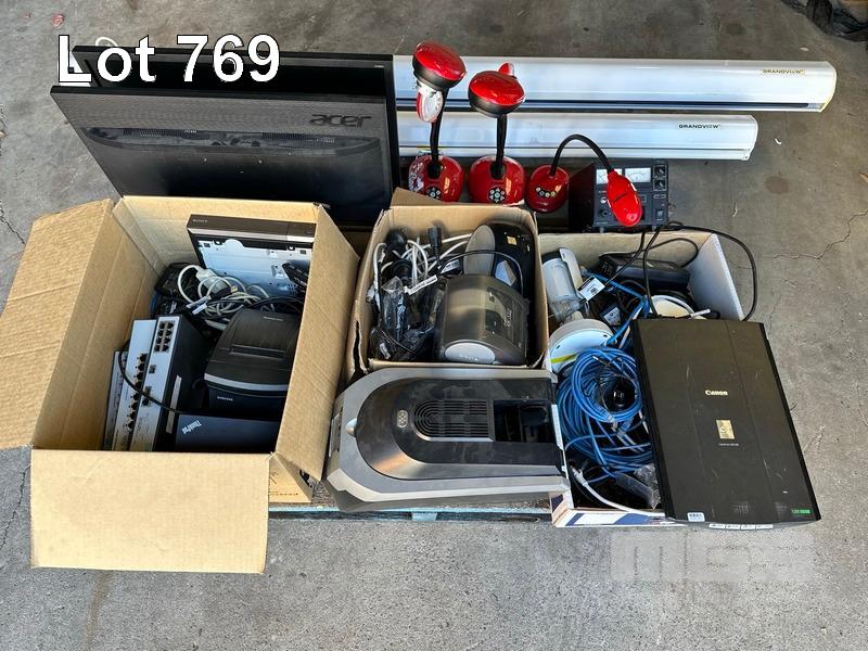 PALLET LOT ASST NETWORKING, LENOVO DOCKING STATIONS (NO POWER SUPPLIES), LABEL PRINTERS, SCANNER, LUMENS DOCUMENT CAMERAS, 2 x MONITORS, 2 x PROJECTION SCREENS ETC