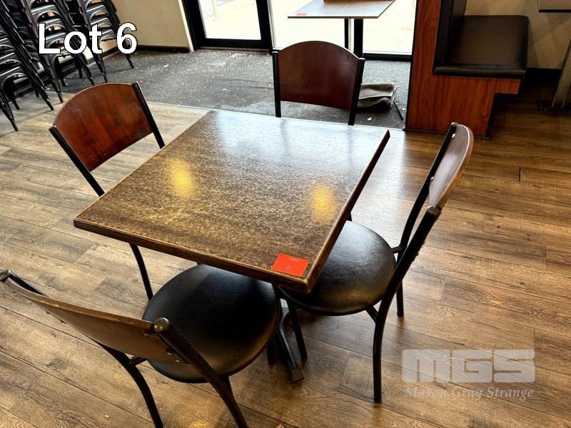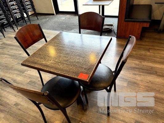 RESTAURANT DINING TABLE & CHAIR SETTING, 1 x RESIN TOPPED DINING TABLE, 700 x 700mm WITH SINGLE METAL PEDESTAL BASE & 4 x BLACK VINYL, TIMBER BACKED, STEEL FRAMED DINING CHAIRS