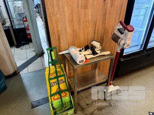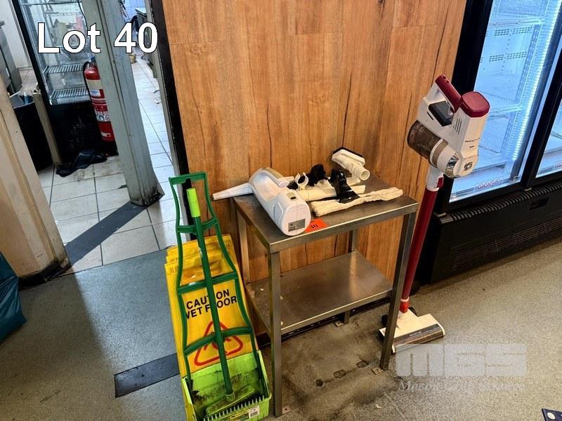 SMALL STAINLESS-STEEL BENCH, INVICTUS VACUUM CLEANER & CLEANING SUNDRIES