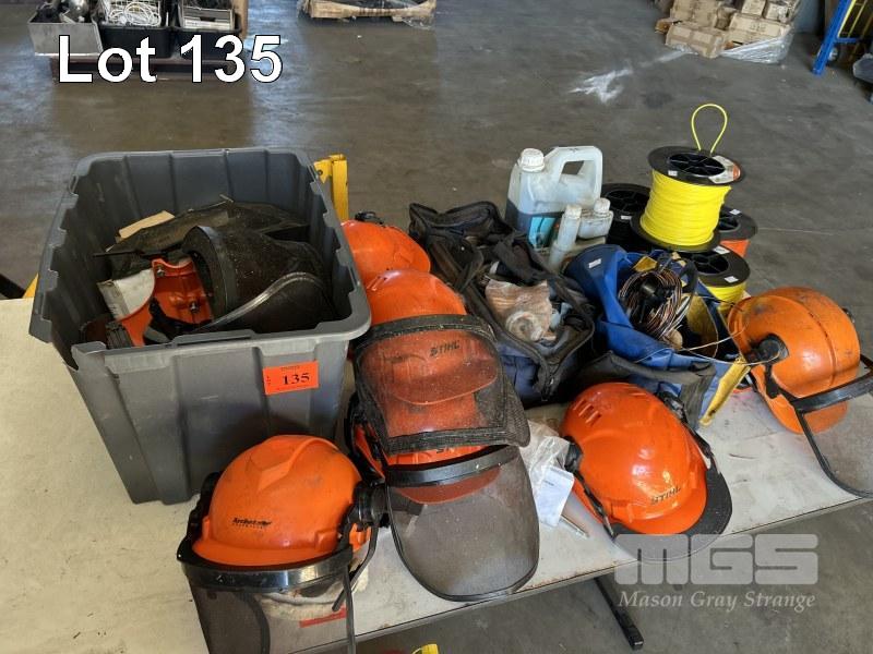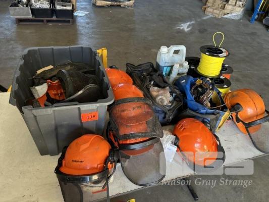 ASSORTED WHIPPER SNIPPER SPARES 2 STROKE OIL, BLADES, HEADS, 4 x LARGE ROLLS CORD, 6 x STIHL HARD HATS WITH FACE SHIELDS