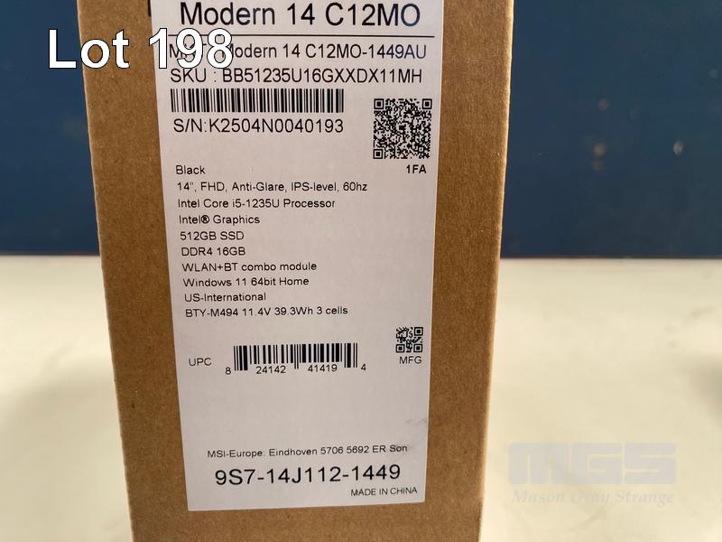 LAPTOP, MSI MODERN 14 C12MO-1449AU NBK BLACK, CORE i5 1235U, 16GB RAM, 512GB SSD, 14 INCH, WINDOWS 11 HOME (RRP $999) (BOXED) (SUBJECT TO INSURANCE CLAIM) S/N:K2504N0040193