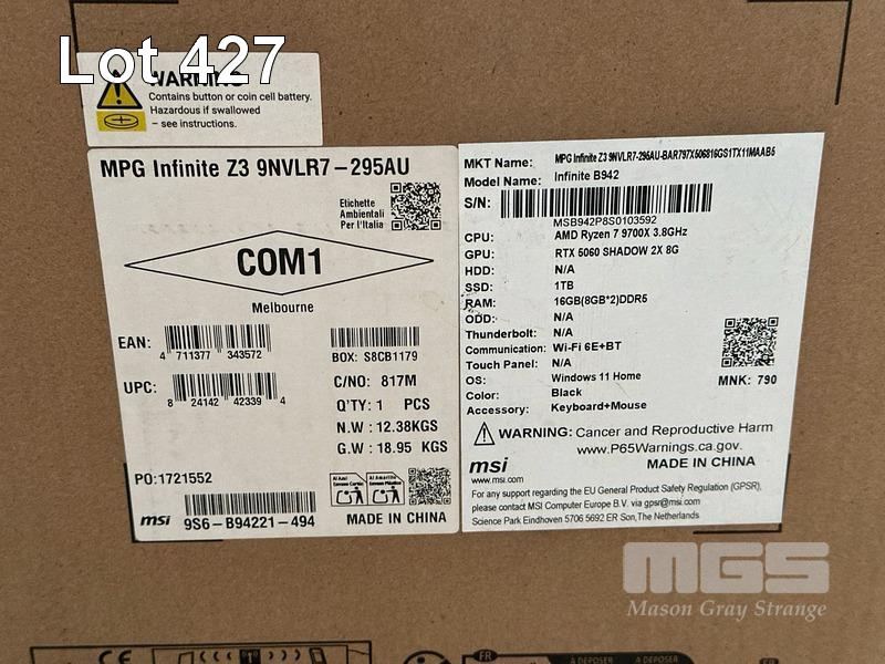 GAMING PC, MSI MPG INFINITE Z3 9NVLR7-295AU RYZEN 7-9700X, 16GB RAM, 1TB SSD, RTX5060 8GB GPU, WINDOWS 11 HOME (RRP $3,499) (BOXED) (SUBJECT TO INSURANCE CLAIM) S/N:MSB942P8S0103592
