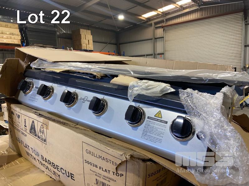 4 BURNER FLAT TOP BBQ WITH TROLLEY, NEW IN CARTON ALL FAULTS