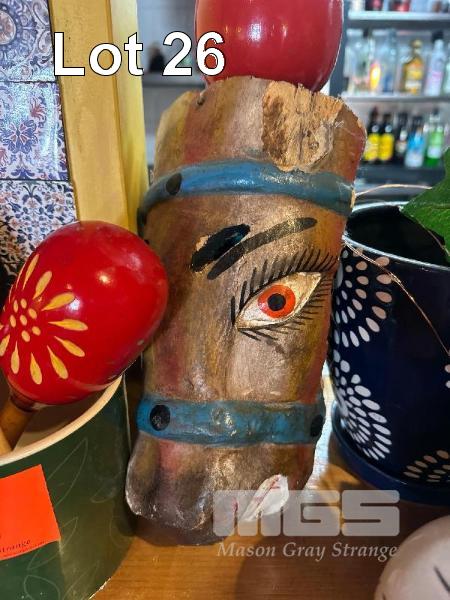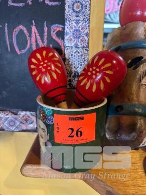 PAIR WOODEN MARACAS, CERAMIC POT & TIMBER MASK